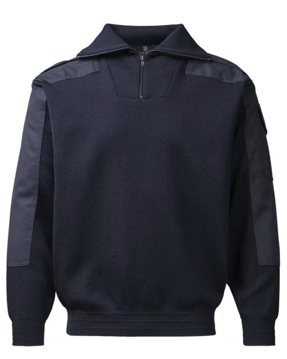 Pulloveren er fremstillet i en uld- og akrylblend, som kombinerer uldens naturlige egenskaber med akrylens holdbarhed og formfasthed. Ulden bidrager med effektiv fugttransport, temperaturregulering og lugtresistens, mens akryl sikrer, at pulloveren bevarer sin facon over tid. Materialet er strikket af et kraftigt heavy-duty garn, der øger slidstyrken markant. Skulderstropper med trykknapper samt twillforstærkninger på skuldre, albuer og ærmer understøtter funktionalitet og lang levetid. Dobbeltlagsmateriale ved kraven og elastisk ribstruktur giver ekstra stabilitet og komfort, mens 1/4 zip-lukningen gør pulloveren nem at regulere efter arbejdsforholdene.