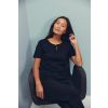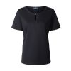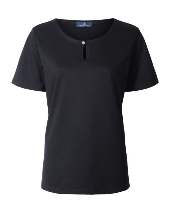 Boat-halsen har en diskret teardrop-detalje, som giver karakter uden at tiltrække unødig opmærksomhed. Korte ærmer, let markeret talje og en feminin, men formel pasform passer til kravene ved frontdesk og i hotellets møde med gæsten.
