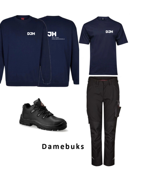 I får F. Engel Galaxy damebukser med figursyet pasform, rummelige lommer og værktøjsloops. Overdelene omfatter hvid unisex T-shirt med sort DJH-transfer både foran og bagpå, samt navy sweatshirt med hvidt DJH-logo. Skoene er Latite S3 sikkerhedssko med skridhæmmende såler, godkendt efter EN ISO 20345. Hvis I ønsker sko med ekstra støtte, kan I opgradere til Fergus S3 ved bestilling.