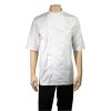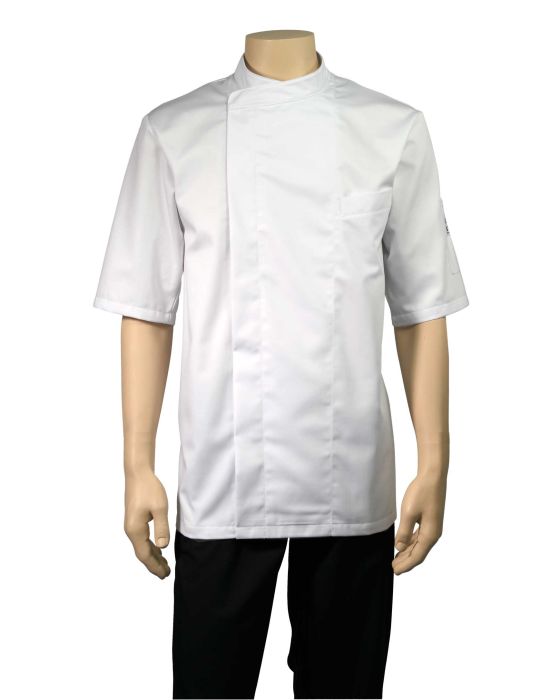 The asymmetrical cut and mandarin collar give a modern look that signals professionalism throughout the team. Hidden snaps prevent loose buttons during service, while the white color supports the industry's hygiene requirements.