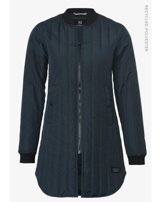 Quilted women's jacket in navy for reception and front-desk staff with a stylish profile. Developed in 100% recycled polyester and proven durability for everyday use.