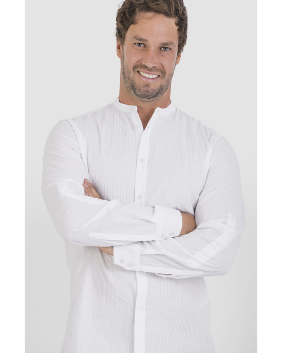 The shirt is made of seersucker woven cotton, which creates a natural distance between the fabric and the skin and thus increases comfort in warm environments. The crinkled structure means the shirt maintains a presentable appearance without the need for ironing, making it ideal for busy workdays. The material is specified with stretch, which contributes to better freedom of movement during physical work. The closed mandarin collar with button closure supports the modern, nautical design, while the closure with both visible and hidden contrast buttonholes gives a complete, professional look. Long sleeves with closed cuffs and a loop at the elbow make it easy to adjust the shirt to the task and temperature.