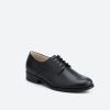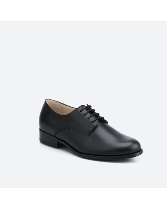 Black lace-up shoe for frontline staff, suitable for a uniform and professional look in reception, restaurant or aviation. Ergonomic insole relieves stress during long shifts.
