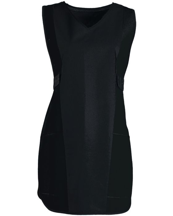 Forklædet har en moderne V-hals, ergonomisk udformet med brede, justerbare stropper og skjulte sideknapper. Det giver fleksibel pasform til alle kropsformer uden at hæmme bevægelse, og sidder stabilt gennem hele vagten. Den sorte tone-i-tone-farve matcher let eksisterende tjenertøj og sikrer konsistent kædelook.