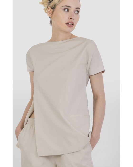Tunikaen er fremstillet i et let, men fast materiale, som giver en god balance mellem komfort og holdbarhed i arbejdssituationer med høj aktivitet. Sideslidserne øger fleksibiliteten i bevægelserne, mens det orientalske snit og den bådformede halsudskæring med dråbeformet detalje og knaplukning tilfører et roligt og professionelt udtryk. Den praktiske paspolerede sidelomme gør tunikaen funktionel i hverdagen, og materialets slidstyrke gør den velegnet til gentagen brug i krævende arbejdsmiljøer.