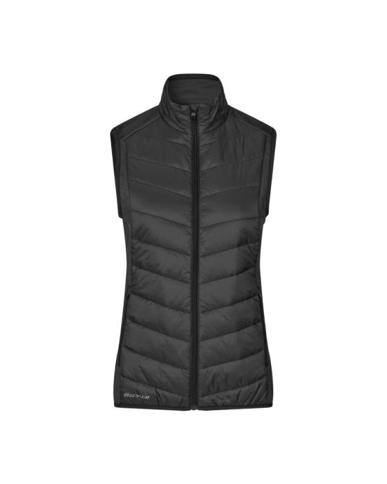 Sporty og komfortabel hybrid‑vest til dame i et tidløst look – ideel som arbejdsvest til hotel‑ og restaurationsbranchen. Front og ryg er i let quiltet, vindtæt kvalitet med isolerende THERMOLITE® T‑DOWN vattering. Siderne er fremstillet i blød 4‑vejs stretch, der sikrer optimal bevægelsesfrihed og komfort. Designet fuldendes med YKK‑lynlås i front, sidelommer, elastiske kantbånd og reflekstrykt detaljer, som gør vesten både funktionel og stilfuld til professionel brug.