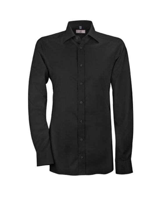 Slim fit skjorte i sort til frontpersonale, udviklet til professionelle teams og daglig brug. Materiale: 76 % bomuld, 22 % polyester, 2 % elastan. Tåler industriel vask.