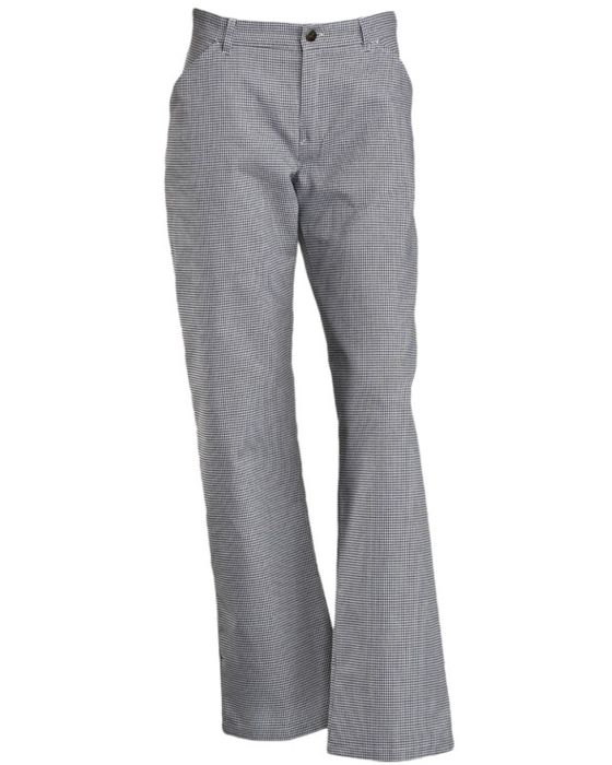Kokkebukser til kvinder i klassisk pepita-tern, udviklet til daglig brug i professionelle køkkener og bagerier. Stoffet er slidstærkt og bevarer pasformen efter mange industrivask.