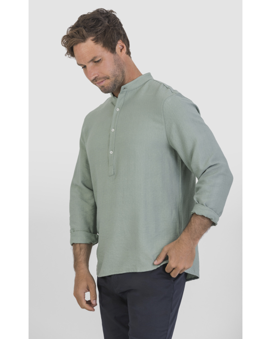 Skjorten er fremstillet i et let og behageligt materiale, som giver høj komfort i varme omgivelser og understøtter en afslappet, velklædt stil. Det naturlige linen-effect med krøllet finish bidrager til et levende udtryk med minimal vedligeholdelse. Den hævede mandarinkrave med knaplukning giver et moderne og elegant præg, mens polo-lukningen med synlige knapper og lange ærmer uden manchetter understreger skjortens uformelle og funktionelle design.